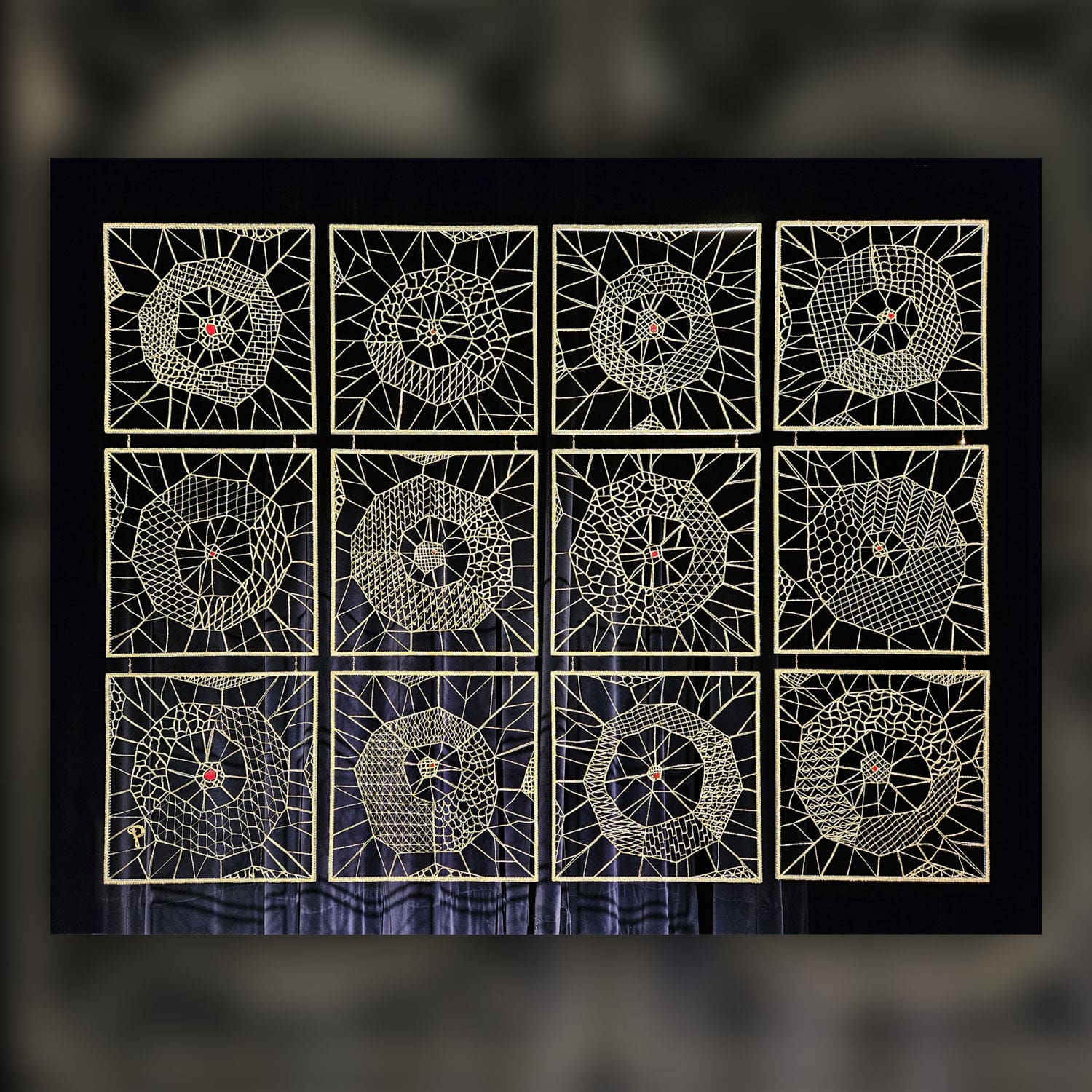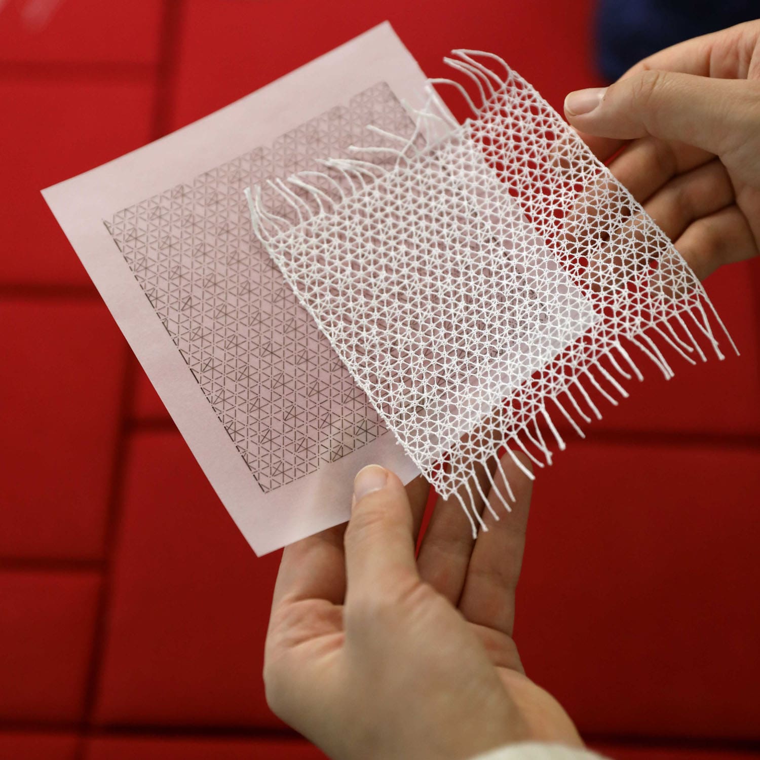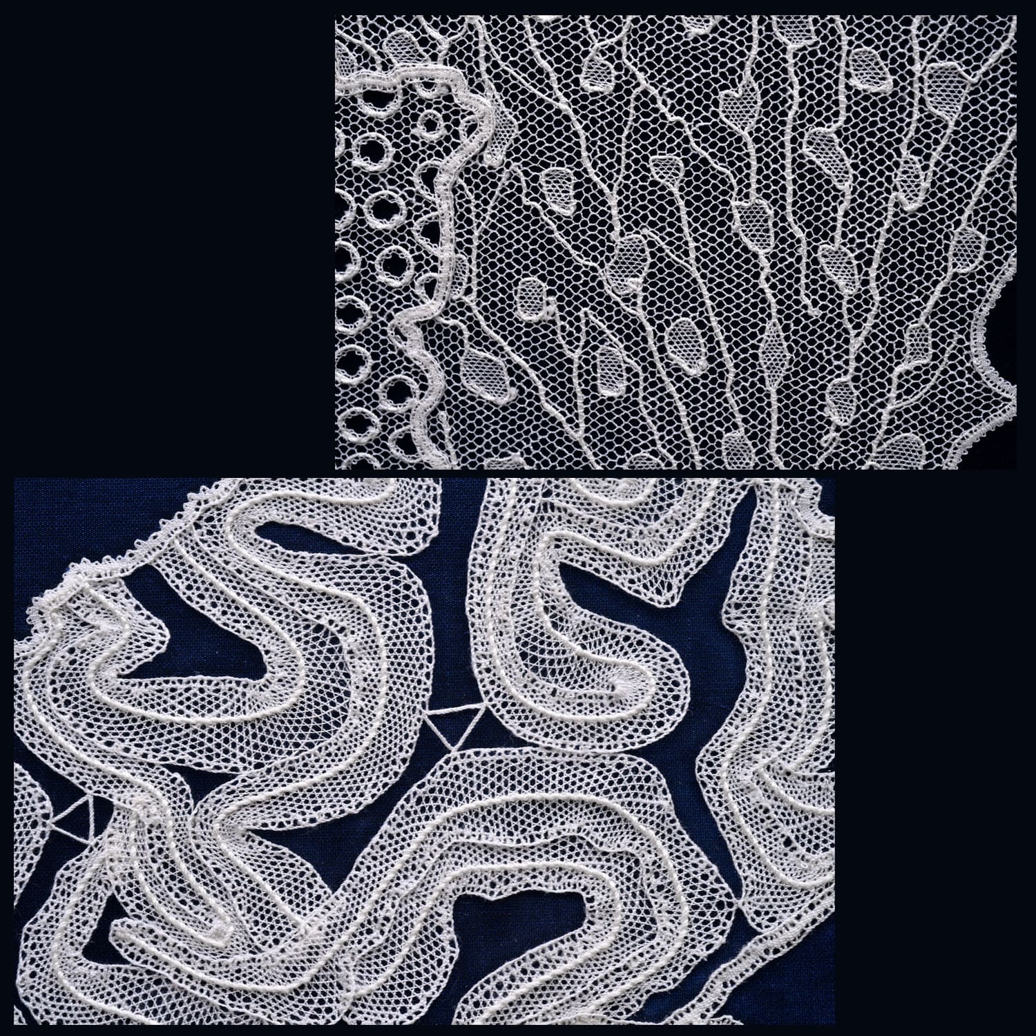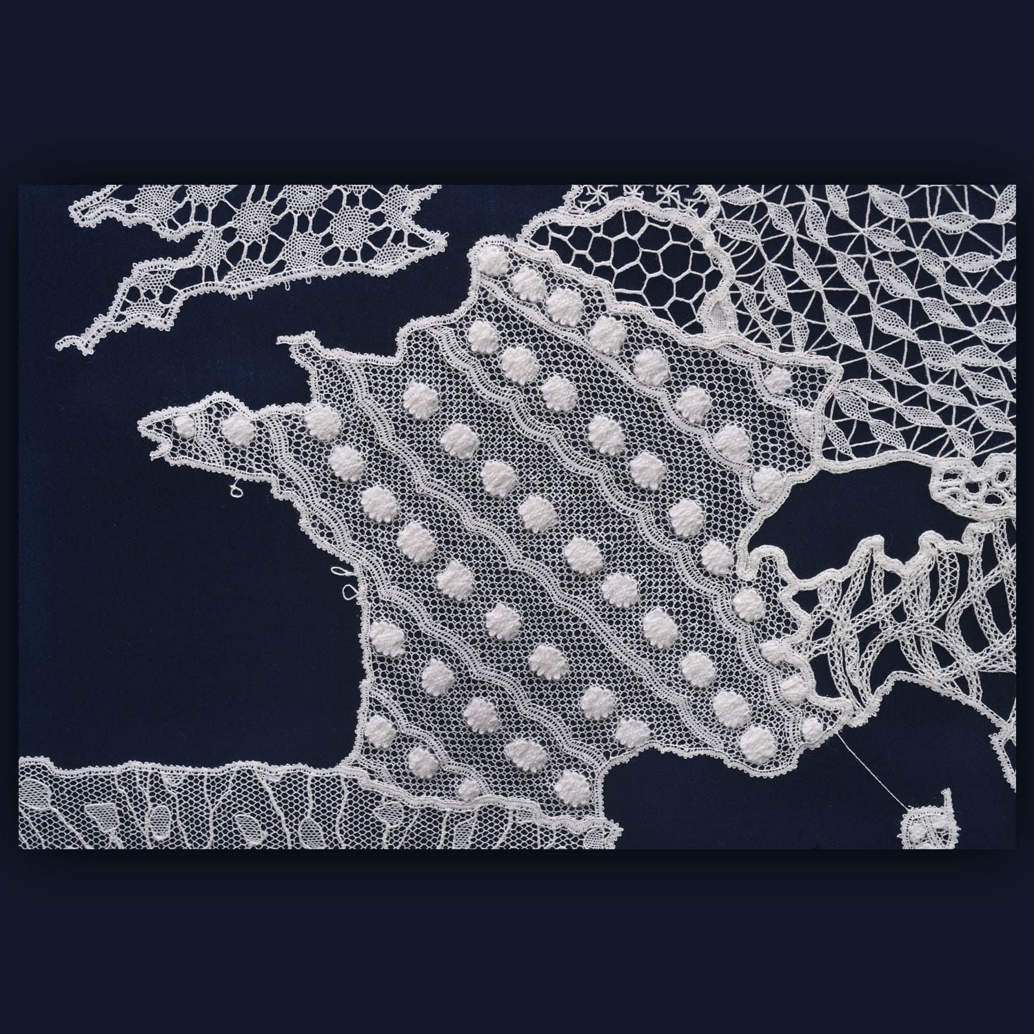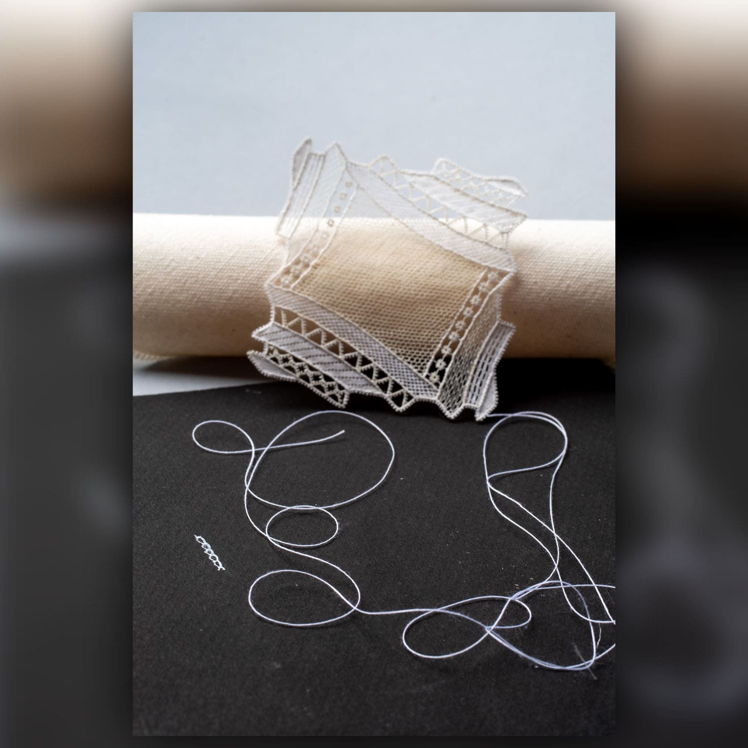 Netzwerk Dies ist das neueste Werk der Alençon-Spitzenkünstlerinnen. Tsuyu Bridwells Arbeit ist von der japanischen Origami-Tradition inspiriert, der kunstvollen Papierfaltkunst, die die Gestaltung komplexer dreidimensionaler Formen ermöglicht. Für die Alençon-Spitzenkünstlerinnen bot die Interpretation dieses Projekts die Gelegenheit, an eine spektakuläre technische Innovation des 19. Jahrhunderts anzuknüpfen: die Herstellung von Alençon-Nadelspitze in Volumen. Tatsächlich präsentierte Madame Hubert aus Mondeville bei Caen auf der Londoner Weltausstellung 1851 einen voluminösen Blumenstrauß. Bei dieser Veranstaltung wurde die Alençon-Spitze zur „Königin der Spitzen“ gekrönt.