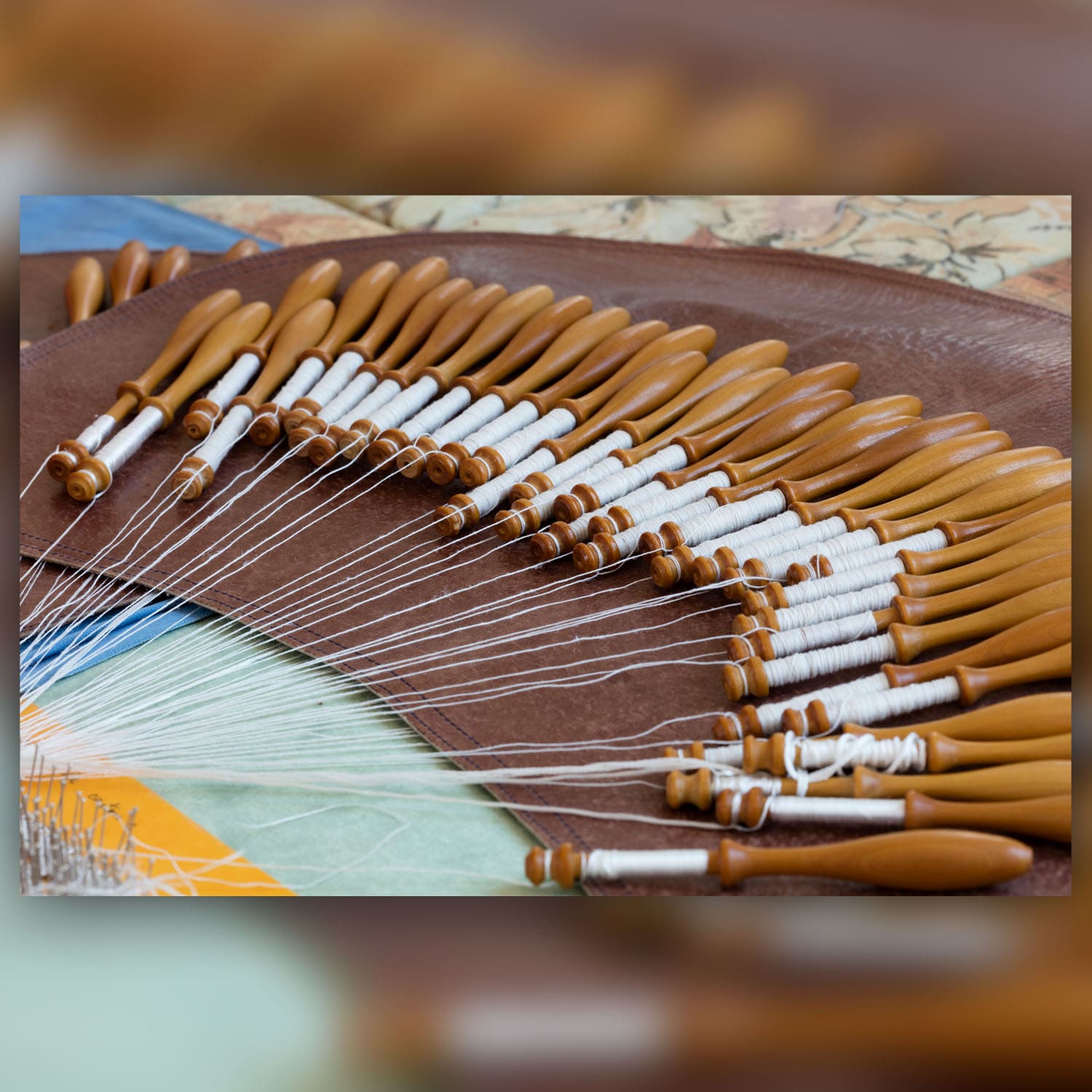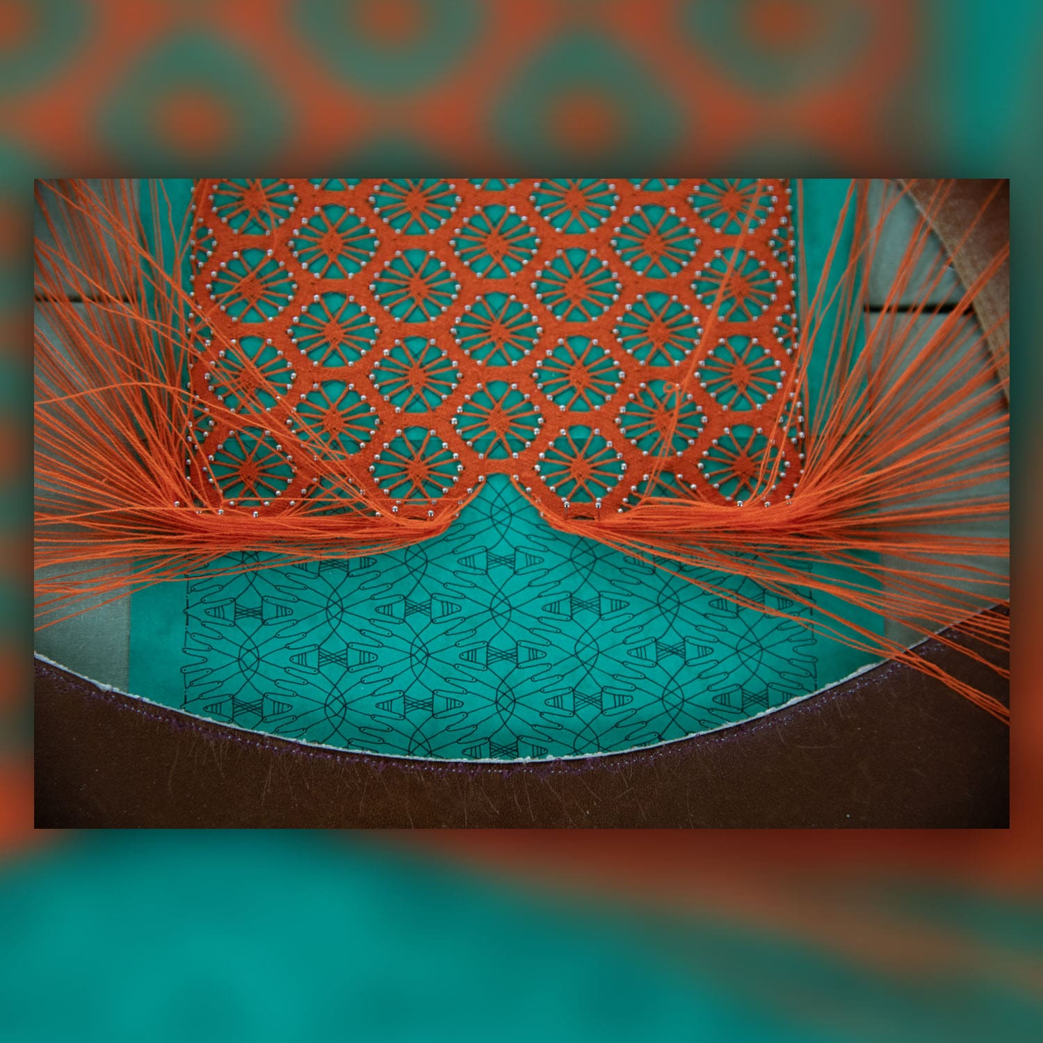 - Puy-en-Velay (Klöppelspitze): Bei dieser Technik werden ein spezielles Stickkissen (Carreau) und Stecknadeln als Vorlage verwendet. Die Fäden werden um kleine Holzstäbchen, sogenannte Spulen, gewickelt. Für die Erstellung komplexer, geometrischer und sich wiederholender Muster sind schnelle, koordinierte Handbewegungen erforderlich.