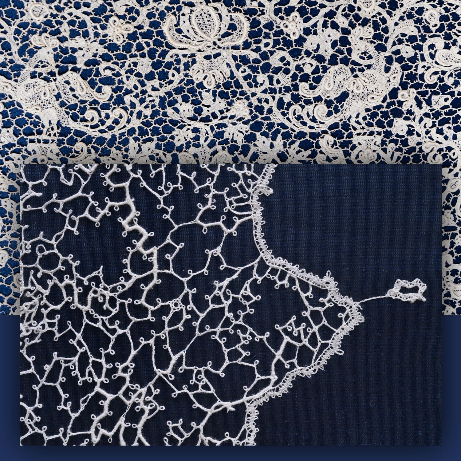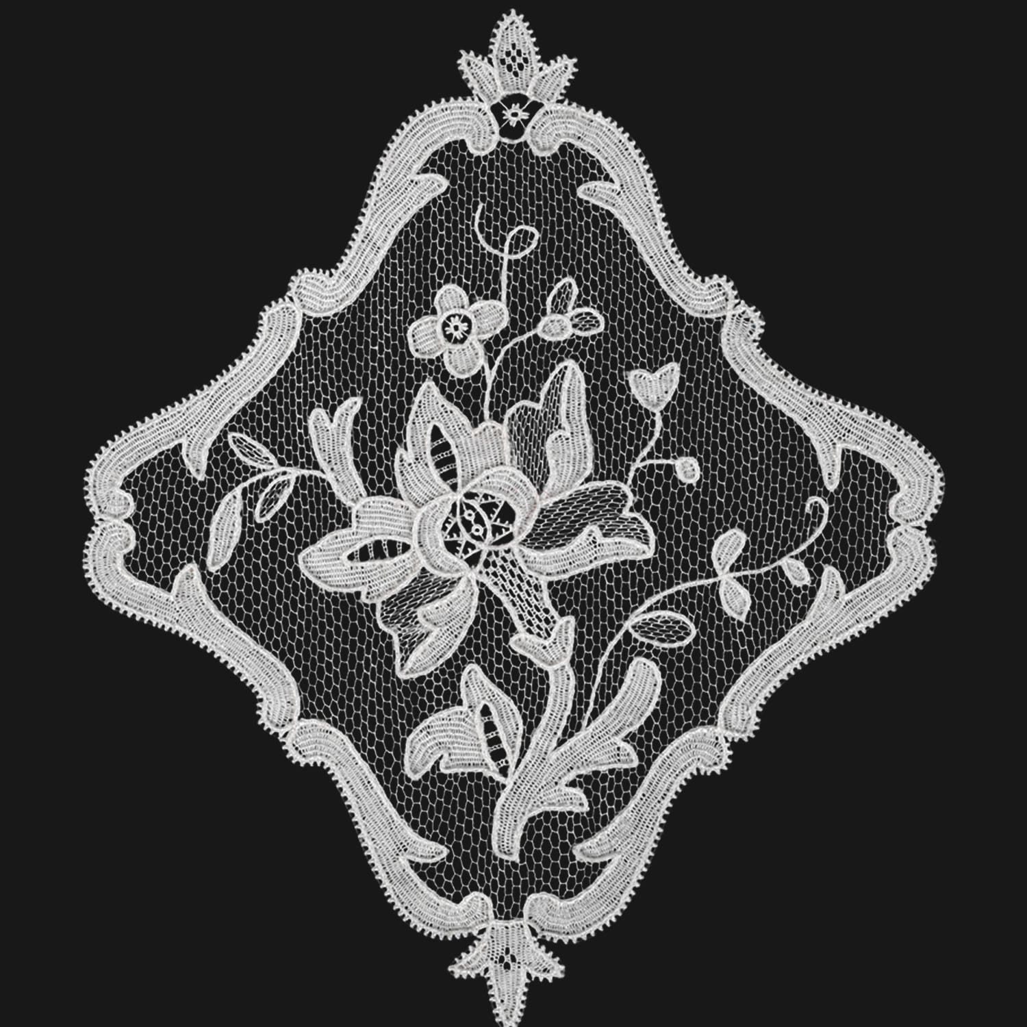 - Alençon (Nadelspitze): Diese oft als „Königin der Spitze“ bezeichnete Technik wird ausschließlich mit Nadel und Faden gefertigt. Jeder Zentimeter wird Punkt für Punkt aufgebaut, was hunderte Stunden präziser Handarbeit erfordert. Das Ergebnis ist ein Textil von unvergleichlicher Feinheit.